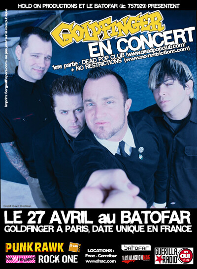 Goldfinger est un groupe mythique dans le milieu du punk rock US respecté pour son sens de l’engagement, notamment pour la défense des animaux. Leur dernier disque, « Disconnection Notice », est une petite bombe de pop-punk. De la génération NOFX/Rancid&co, le groupe est une des principales influences des stars du pop-punk d’aujourd’hui, de Simple Plan à Good Charlotte. Son frontman légendaire, John Feldman, est même celui qui a découvert Story Of The Year, Mest et surtout The Used. C’est donc l’occasion de prendre son pied avec un concert de folie et unique en France! D’autant plus que les premières parties sont Dead Pop Club et No Restrictions, deux valeurs sûres de la scène française.